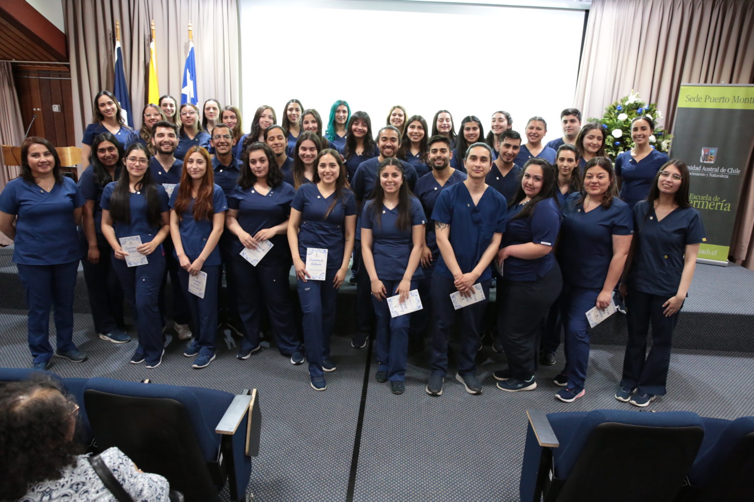 El jueves 03 de noviembre en el Aula Magna del Campus Pelluco de la Sede Puerto Montt de la Universidad Austral de Chile se desarrolló la Ceremonia de Titulación de la Escuela de Enfermería, en la que egresadas/os vivieron emotivos momentos junto a familiares y docentes.