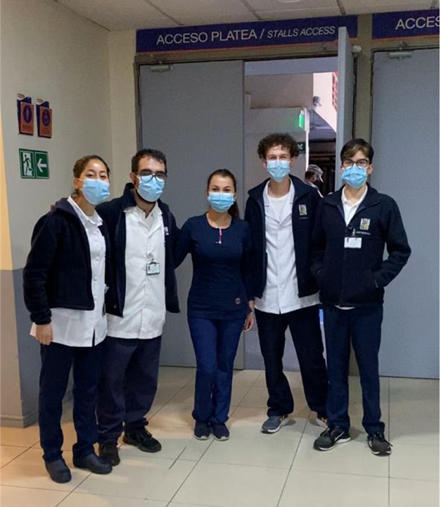 Nuestra Escuela de Enfermería UACh participa de manera voluntaria apoyando vacunación del Coronavirus durante el mes de marzo, con estudiantes de distintos niveles, estimulando la vocación para contribuir y colaborar con esta histórica. En la fotografía del día martes 16 de marzo, la docente María Paz Sandoval junto a un grupo de 4 estudiantes, durante el mes de marzo se van rotando al menos tres veces por semana diferentes grupos de estudiantes y docentes.